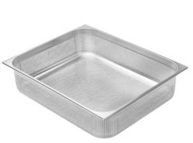 Nerezová děrovaná gastronádoba o rozměru 650x530mm vyrobená z jednoho kusu nerezu 18/10. Průměr perforace 4mm. Perforace od hloubky 100mm po celém obvodu 7-0-0-0|7-54-0-0. Výška 7-0-0-0|7-54-0-0: 65mm.